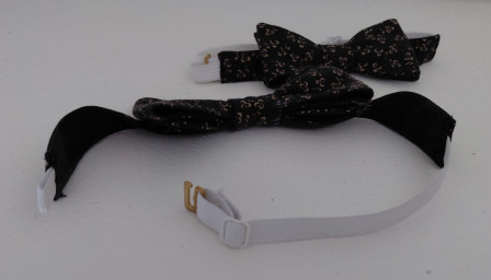 Au tout début, j'ambitionnais de faire un vrai noeud papillon mais comme je n'ai jamais réussi à faire le noeud, j'ai opté sagement pour le modèle avec noeud déjà fait et attache à l'arrière.